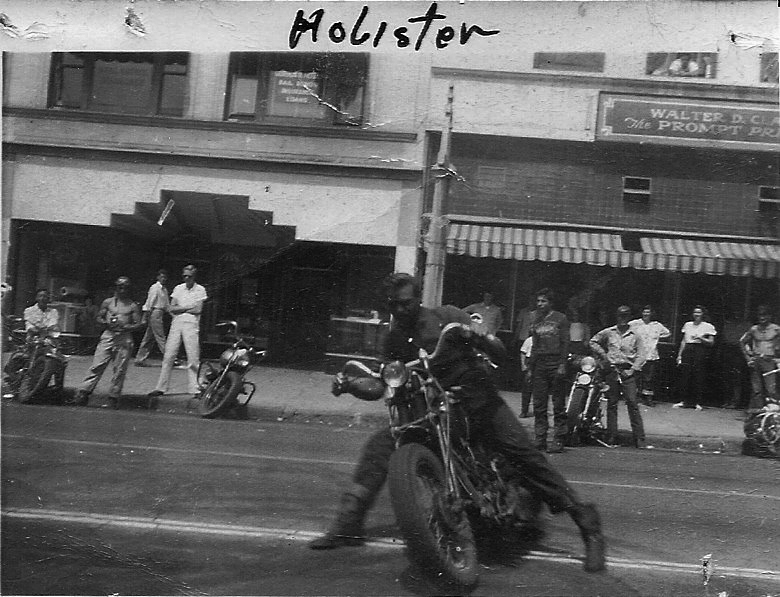 L’histoire, vous la connaissez sans doute. Ce fameux week-end du 4 juillet 1947, l’American Motorcycle Association (AMA) organisait une édition de son célèbre Gypsy Tour (un terme générique qui, dès les années 1920, désignait un rassemblement national de motards), incluant courses de Dirt Track, compétitions de Hill Climbing et autres animations. La petite ville californienne de Hollister avait déjà accueilli le rassemblement tout au long des années 1930, mais cette édition de 1947 avait une saveur particulière : c’était la première depuis que la guerre avait mis un terme aux festivités, et cela tombait le jour de l’Independance Day. Ainsi, de nombreux motards, moto-clubs (au premier rang desquels les Boozefighters, les Galloping Goose, les 13 Rebels et les Pissed Off Bastards of Bloomington, dont certains membres allaient participer un an plus tard à la création des Hells Angels) et simples curieux se réunirent dans la petite ville. Débordés, les organisateurs ne purent contenir longtemps cette nouvelle génération de motards qui, déçus de ne pouvoir prendre part à la course officielle sur la piste de Bolado Park, se rabattirent vers le centre ville pour s’y livrer à des courses improvisées et festoyer dans les bars… Rien de bien méchant. Mais, monté en épingle par la presse, l’événement est devenu, avec le temps, le symbole de la naissance de la contre-culture biker.