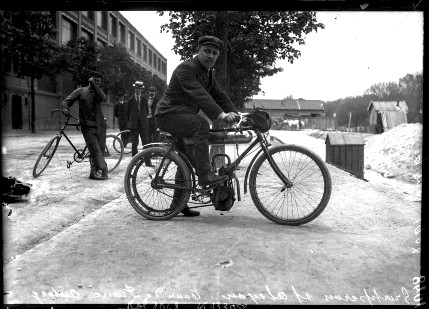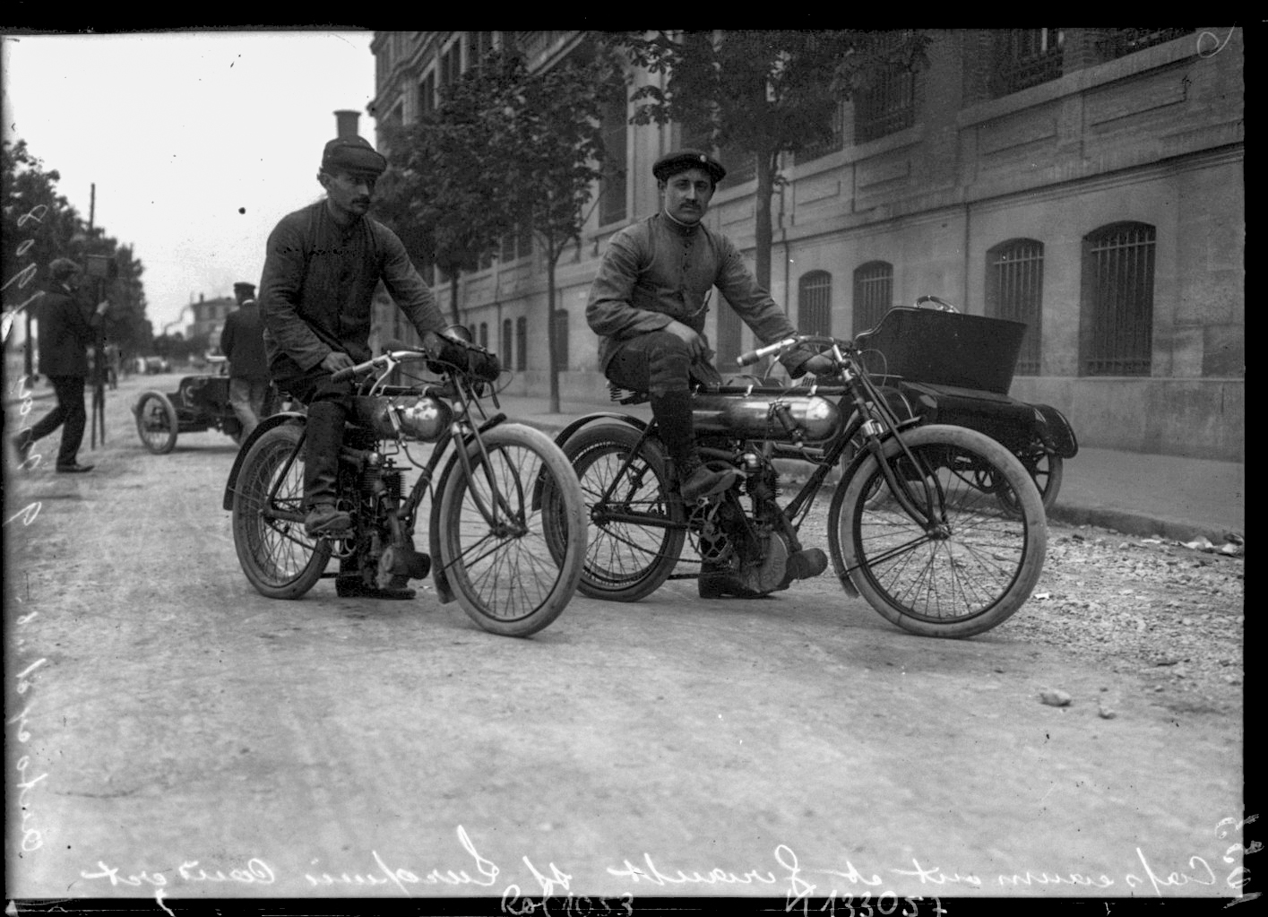 Voici donc deux photos de cette troisième édition du Tour de France, disputé du 11 au 17 mai 1908 sur un parcours Paris-Dijon-Clermont-Limoges-Bordeaux-Tours-Paris. On y voit le pilote Grapperon sur une Alcyon (marque française sise boulevard Bourdon à Neuilly-sur-Seine et qui fabriqua des bicyclettes, des motocyclettes et des automobiles de 1903 à 1954), et les pilotes Capeaumont et Girault sur des Lurquin-Coudert (marque française sise au 289 de la rue du Faubourg Saint-Antoine à Paris, qui fabriqua des “motocyclettes” de 1899 à 1914).